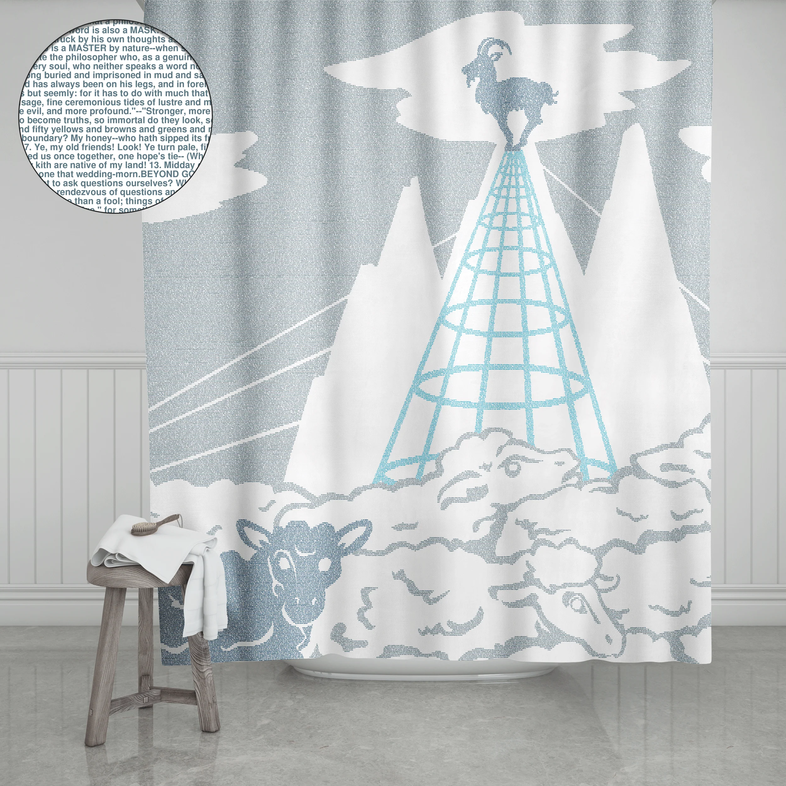 This shower curtain is created from the text of Beyond Good and Evil by Friedrich Nietzsche.