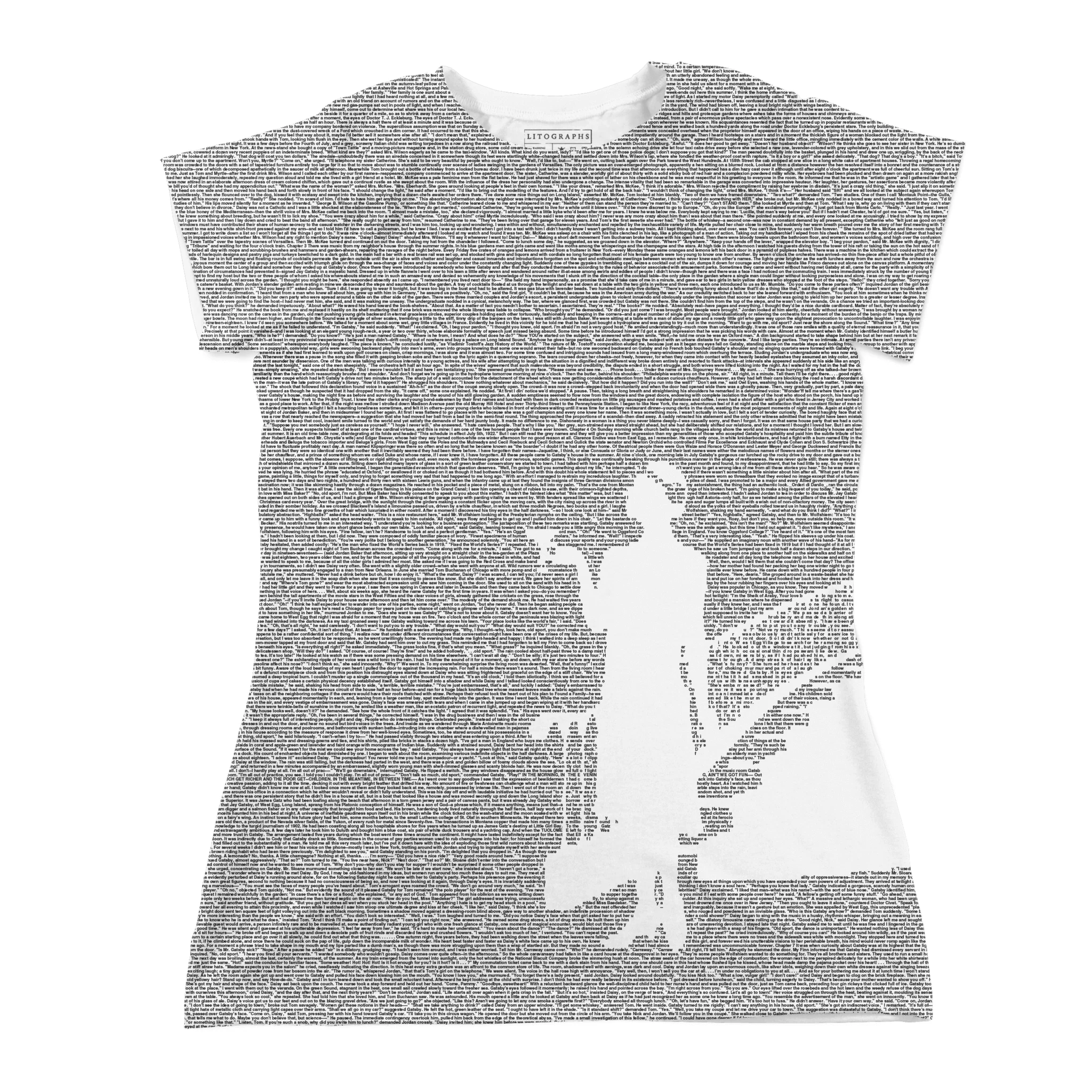 This t-shirt is created from the text of The Great Gatsby by F Scott Fitzgerald.