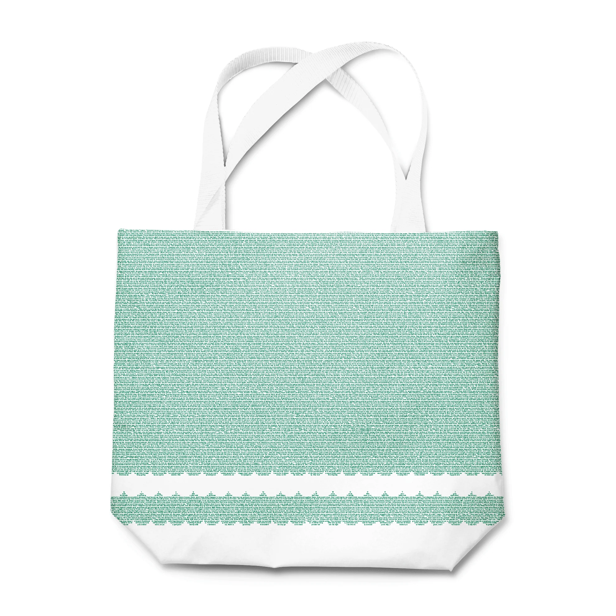 This tote bag is created from the text of Adventures of Huckleberry Finn by Mark Twain.