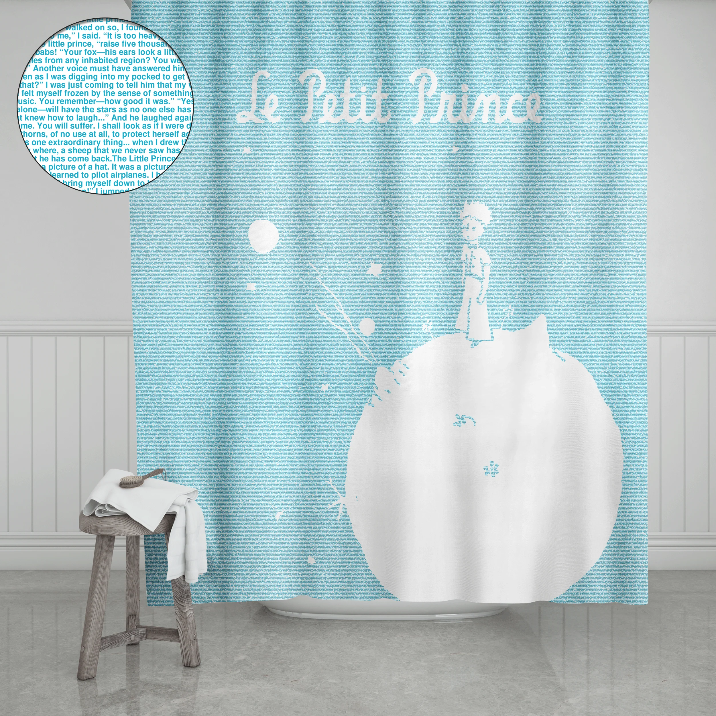 This shower curtain is created from the text of The Little Prince by Antoine de Saint-Exupery.