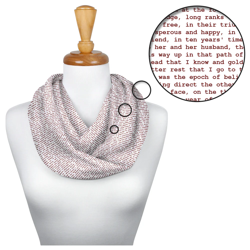 This scarf is created from the text of A Tale of Two Cities by Charles Dickens.