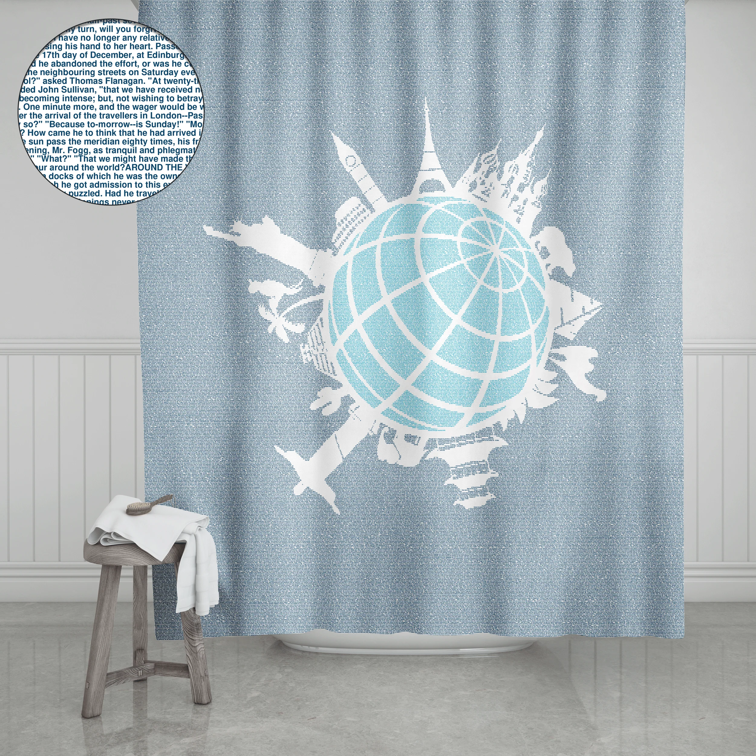 This shower curtain is created from the text of Around the World in 80 Days by Jules Verne.